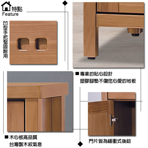 (如圖,網頁產品因電腦螢幕設定差異及拍攝關係請以實品顏色為準。 不含情境圖內之擺設飾品,尺寸標示皆有正負3%差) 商品規格 名稱:香杉3x6尺美檜鞋櫃 型號:UZ6-400-2 內容:木心板、鋼珠滑軌、緩衝式後鈕 尺寸:寬88x深40x高178公分 體驗說明 使用方法說明 無 注意事項 如圖片所述