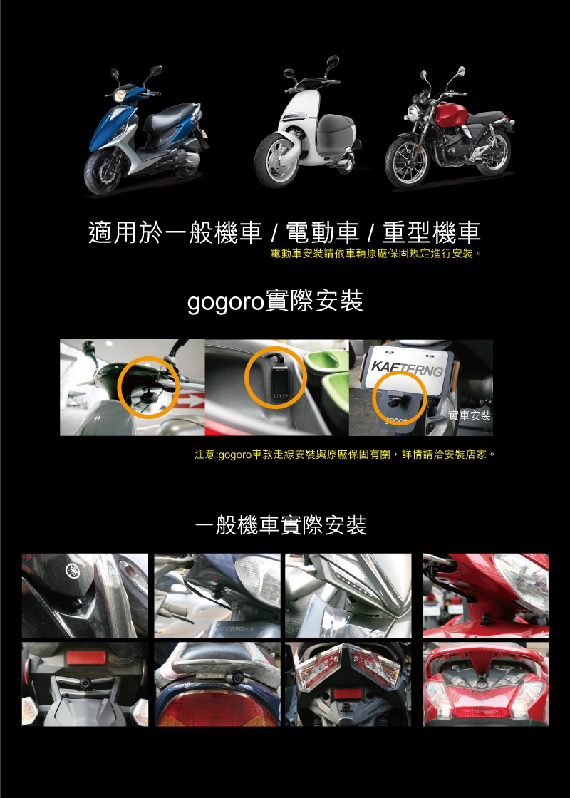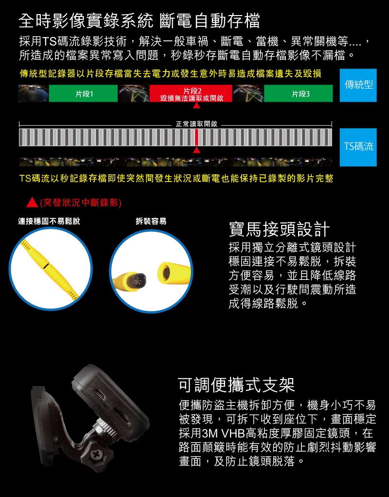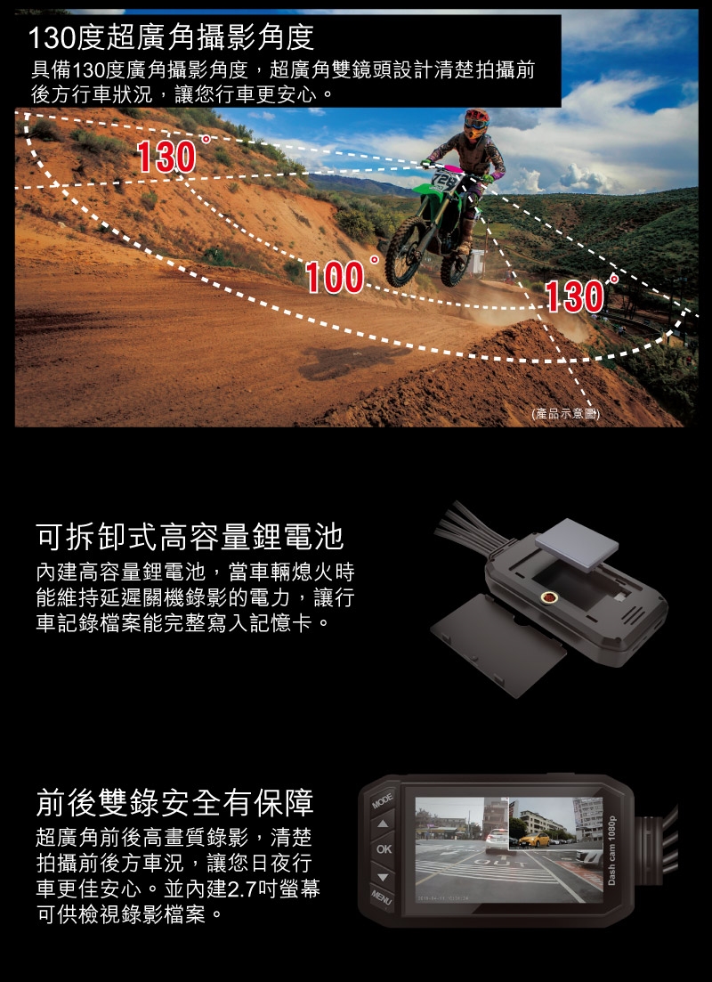 產品特點: Gogoro 相容 TS碼流全時影像實錄系統斷電自動存檔 新製程全志V3低耗能高速處理器 前後鏡頭130度超大廣角 F1.8超大光圈 前後鏡頭IP67防塵水等級 外置防水多功直覺線控器 外置線控一鍵鎖檔 外置式現場收音高感麥克風 外置式高亮藍光LED狀態指式燈 高容量快拆式鋰聚合物電池 車電啟動/循環錄影/邊充邊錄 熄火後延遲關機錄影 2.7吋高解析液晶面板 130度超廣角錄影
