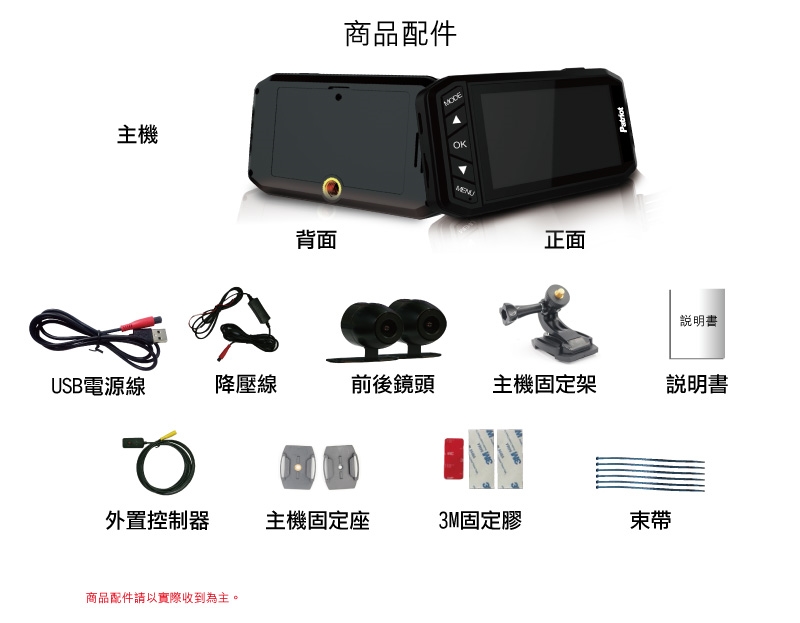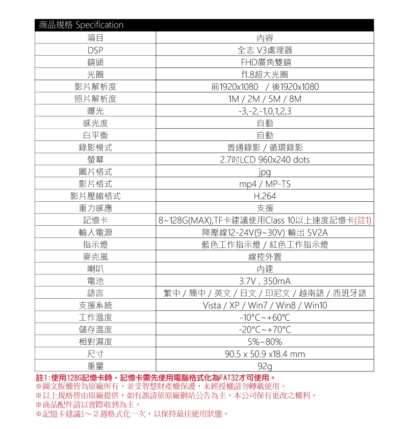 商品規格 商品名稱 : 愛國者 F3 前後Full HD 1080P 金屬防水機車雙鏡行車記錄器 品牌 : PATRIOT愛國者 類型 : 機車用 型號 : F3 機身尺寸 : 90.5x50.9x18.4 mm 重量 : 92g 錄影角度 : 121~130度 特殊功能 : G-sensor碰撞感測器, 麥克風 影像解析度 : 1080P 螢幕尺寸 : 2.7" 鏡頭光圈 : F1.8 記憶卡擴充 : 8g~128g(MAX)、TF卡建議使用Class 10 以上速度記憶卡 電池容量 : 3.7V 、 350mA BSMI認證碼 : D33H07 產地 : 中國 體驗說明 使用方法說明 詳如商品說明書 注意事項 1. 使用前請先詳讀說明書。 2. 本文案僅供參考,本商品有可能因時間而改變韌體、功能或零組件,請依實際收到商品為主。 3. 錄影前請先插入記憶卡,並專卡專用、定期1-2周格式化,以維持最佳錄影效能。記憶卡建議使用 8G C10以上之速度。 4. 開啟循環錄影模式時,當記憶卡存滿,將自動刪除最原先的錄影檔;如有鎖定的檔案,則不會被刪除覆蓋,請定期清理記憶卡之檔案,以免造成鎖檔過多,而無法錄影。 5. 商品請使用內附之原廠配件,如使用其它配件造成商品損壞將失去原廠保固。 6. 商品所有包裝盒(袋)、保護貼,在您未確定購買前請勿撕下丟棄。搭贈之贈品,在未確定購買主商品時,贈品拆封無法回復原狀時視同您願意以原價購買,請消費者多留意,以免造成商品無法退換貨。 7. 本商品主機保固一年,配件保固三個月。