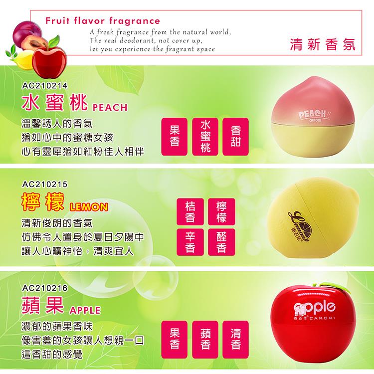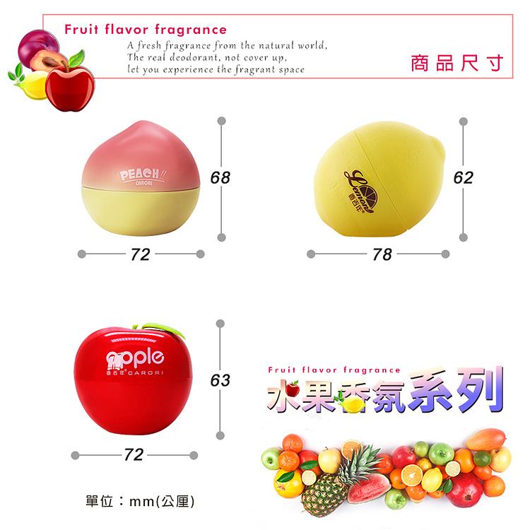 清新果漾 水果造型系列香氛 (水蜜桃/檸檬/蘋果) ◆特點推薦 ★採用法國曼式香料 ★水果擬真造型 ★附黏貼雙面膠 ★三款味道可供選擇 ★車用/居家/辦公室,可依喜好放置 ◆產品介紹 ☆★☆法國曼式香料,真正分解異味☆★☆ ☆★☆水果擬真造型,百年香氛清新療癒☆★☆ 商品詳細介紹 清新果漾 水果造型系列香氛(水蜜桃/蘋果/檸檬) 你還在忍受車內異味嗎?