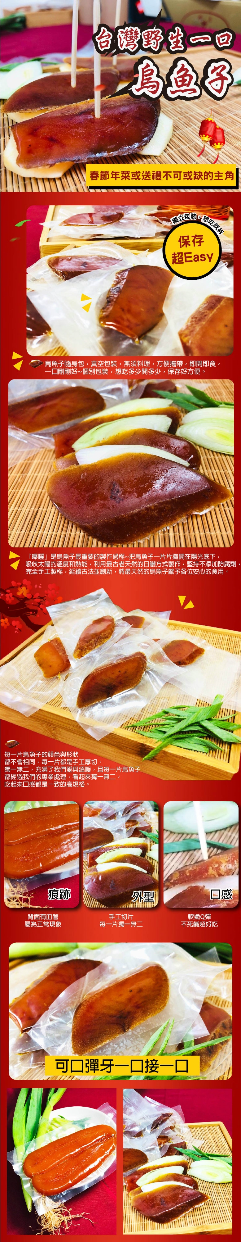 不死鹹超好吃 手工厚切 口感 品質面面俱到 品牌 無類型 魚類組合說明 烏魚子150g部位 烏魚子切法 片狀內容量 g 份 150g產地 台灣食用方式 解凍即食配送方式 冷藏保存期 售價:6780