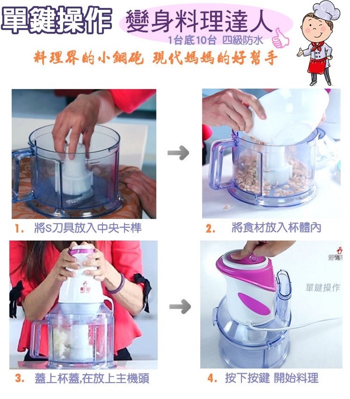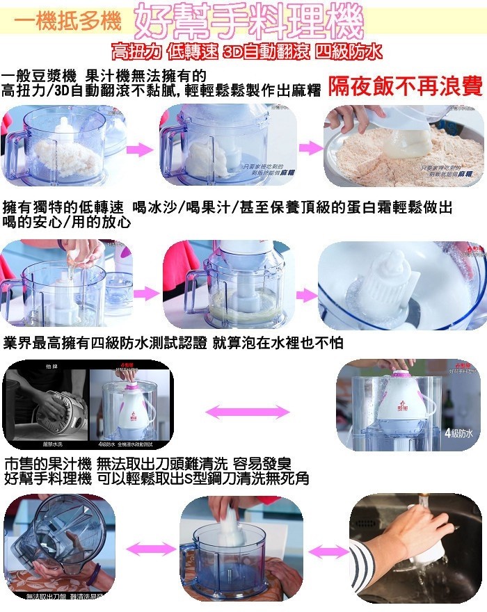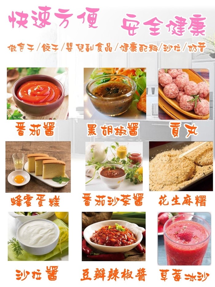 ◎攪碎/打蛋/副食品等難不倒!不管做水餃餡、沙拉醬、蛋糕、魚丸、貢丸、花枝丸、沙茶醬、冰沙、麻糬等,還是各項廚房料理 一機即可輕輕鬆鬆準備。