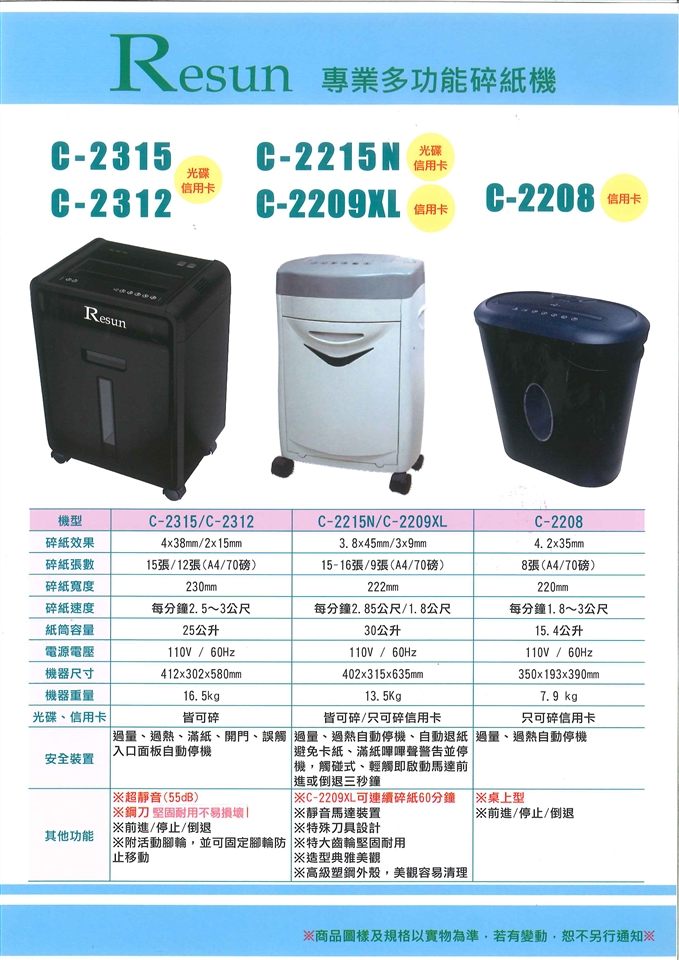 可碎信用卡 光碟片 超靜音55db 附活動輪子 品牌 RESUN型號 C 2312碎紙形狀 碎斷式碎紙張數 11 20張可碎物 一般紙張 信用卡 光碟片碎紙容量 21 40公升碎紙尺寸 2x15m 售價:8800