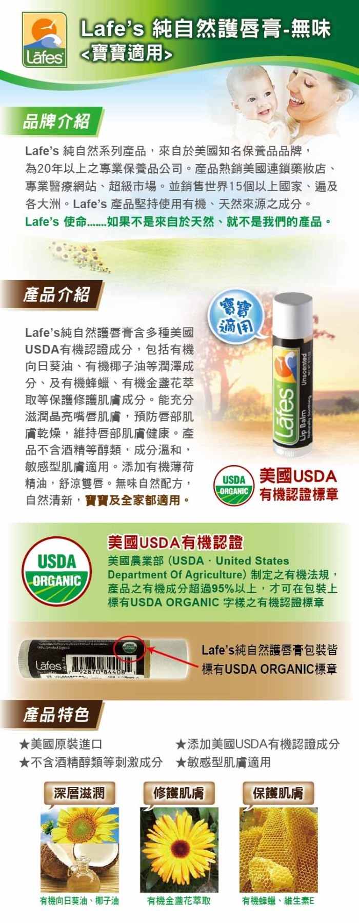 Lafe’s 純自然護唇膏含多種美國USDA有機認證成分,包括有機向日葵油、有機椰子油等潤澤成分、及有機蜂蠟、有機金盞花萃取等保護修護肌膚成分。能充分滋潤晶亮嘴唇肌膚,預防唇部肌膚乾燥,維持唇部肌膚健康。產品不含酒精等醇類,成分溫和,敏感型肌膚適用。無味自然配方,自然清新,寶寶及全家都適用