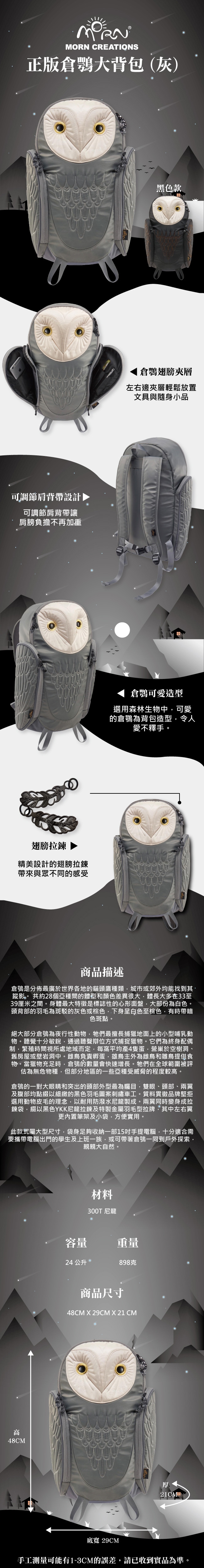 香港原廠授權販售 品牌源自於對動物保護及珍惜 經典貓頭鷹造型 品牌定位 流行時尚品牌 MornCreations背法 後背款式 後背包顏色 多色組合 灰色系 混色系 撞色系外層材質 售價:6800