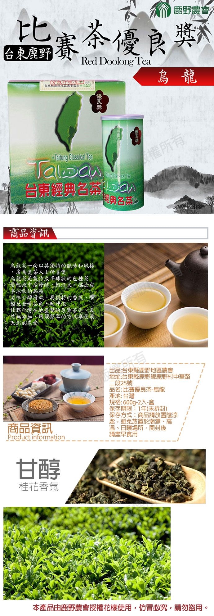 商品規格 商品名稱 : 比賽優良茶-烏龍 品牌 : 農會 農會 : 鹿野農會 主要茶種 : 烏龍茶 包裝 : 茶葉禮盒 重量區間 : 1-2斤以下 實際重量 : 600g 烘焙程度 : 無烘焙 內容物說明 : 1+1 600g-2罐-盒 (1盒組 共2盒) 保存方式 : 常溫請置陰涼處 熱量 : 依商品包裝上顯示 每份營養成分 : 依商品包裝上顯示 咖啡因含量 : 依商品包裝上顯示 贈品 : 無 產地 : 台灣 保存期限 : 1年(未拆封) 廠商名稱 : 台東縣鹿野地區農會 廠商地址 : 台東縣鹿野鄉鹿野村中華路二段25號 食品業者登錄字號 : V193280809-00002-0 投保產品責任險字號 : 0530字第17AML0000054 其他事項 : 根據消費者保護法第19條規定商品到貨享有七日鑑賞期之猶豫期權益(注意!猶豫期非試用期) 體驗說明 使用方法說明 無 注意事項 出品:鹿野地區農會 地址:台東縣鹿野鄉鹿野村中華路二段25號 食品業者登錄字號:V193280809-00002-0 投保責任險字號:0530字第17AML0000054 品名: 比賽優良茶-烏龍 產地: 台灣 規格: 600g-2罐-盒 保存期限:1年(未拆封) 保存方式:商品請放置陰涼處,避免放置於潮濕、高溫、日曬場所,開封後請盡早食用 【注意事項】 行政院農委會2015年6月起公布,食品類別(生鮮+蔬果等)不適用網路消費七天鑑賞之規範 食品類別(生鮮、冷凍、冷藏、蔬菜、水果等)除商品本身毀損、破裂、滲漏、失溫等等均恕無法辦理退貨 根據消費者保護法第19條規定商品到貨享有七日鑑賞期之猶豫期權益(注意!猶豫期非試用期) 消費者完成簽收取件起的隔日開始計算至第七天為止;如是以管理員代收,則以代收起隔日計算。 除商品本身毀損、破裂、滲漏等、或商品已經拆封無法回復原狀者,本公司恕不辦理退貨退款作業 請見諒。 收到貨品後如因非人為因素之商品損毀、刮傷、或運輸過程造成包裝破損不完整及瑕疵,請儘速通知本公司,並儘速補寄新品 退換貨時,商品必須是全新狀態與完整包裝及所有附隨文件或資料的完整性,切勿缺漏任何配件或損毀原廠外盒 每部電腦顯示器所呈現的顏色不盡相同,圖片僅供參考,顏色請以實際收到商品為準。 【宅配說明】 1.台灣本島免運費。 2.所有商品收件地址請勿填寫郵政信箱。 3.商品在交易完成後2-3個工作天內送達(不含例假日)。 4.此產品只配送台灣本島,外島地區的朋友請利用台灣親友地址做為收貨地址,不便之處敬請見諒。 5.全省農會周休二日(包含國定假日&連假) 週五午後訂單統一 隔周一出貨,不便之處敬請見諒